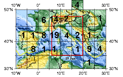 Since 15 January the closest that any earthquake was to Canneto was about 186 nautical miles due South in the central Mediterranean (Lat 34.9N Long 14.4E). The location of that earthquake, which occurred on 19 January, is shown as a white dot on the map below. The author is not familiar with the earthquake history around Sicily but thinks it odd that with all the volcanoes in the area, no quakes with magnitude greater than 1.0, closer than the one just mentioned, have occurred on or close to Sicily since mid January. The total numbers of earthquakes (in 5 degree Latitude by 5 degree Longitude bins) are shown for February 2004. (These totals represent quakes which were less that 1000 nautical miles from Canneto. Quakes in Portugal and in the westernmost part of Spain were not used in the totals.)