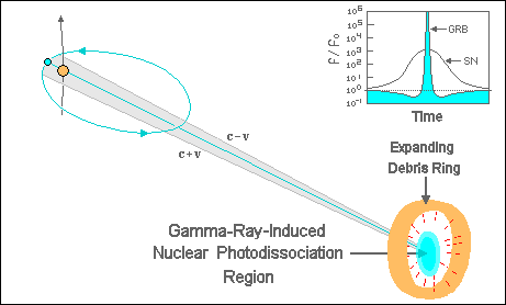 The star responsible for SN 1987a is thought to be located in the Large Magellanic Cloud (163,000 LY distant). The fact that the rings of the Triple-Ring Nebula have different centers may be explained by their source being a member of a multiple star system (most likely a triplet), and as such it has been moving in it's orbit to furnish new loci for the sequence of expanding rings. For a highly elliptical orbiting binary, where Ritz/de Sitter post perihelion c+v light catches up with pre-perihelion c-v light, there can be a spike of ultra-high energy gamma radiation, coincident with the peak of what looks like a supernova explosion, which can photodissociate the majority of the heavier nuclei in the catch-up region. Protons, neutrons, and electrons (the primary photodissociation products) will speed out of this region in all directions. (This process will essentially be a diffuse nuclear explosion.) In a nutshell, the Ritz/de Sitter arrival time modulation can cause a large percentage of the starlight which has been normally emitted during a sizable fraction of the orbit period (This would correspond to the arc near perihelion that bounds the extended shaded wedge in the diagram.) to be compressed in a few tens of seconds. That time compression produces extremely high frequencies and energies.